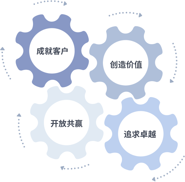 成就客户是一切决策的出发点,,创造价值是衡量所有工作的标准,,,追求卓越是我们做事做人的态度,,,,开放共赢是我们的格局也是最终的结果。。价值观的齿轮环环相扣,,,推动着组织里的每个人不断向前。。。。